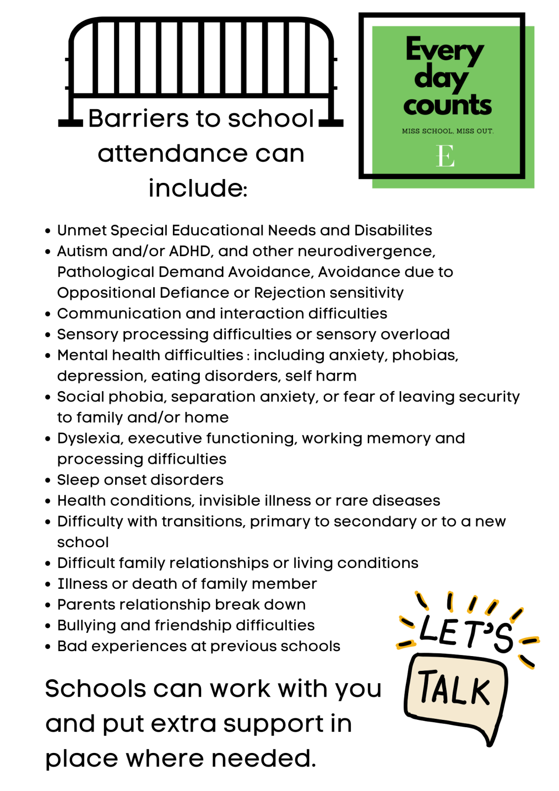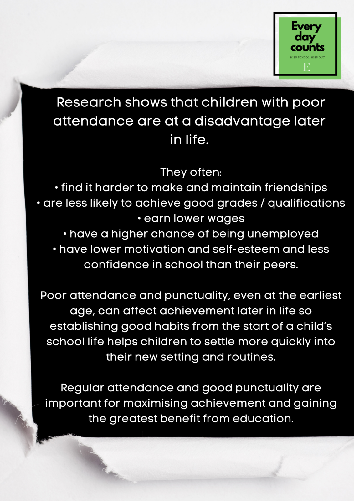 If you require any attendance advice we are here to help and support you. In the first instance speak to your child's class teacher who will be able to signpost to relevant resources or further support from our pastoral team.