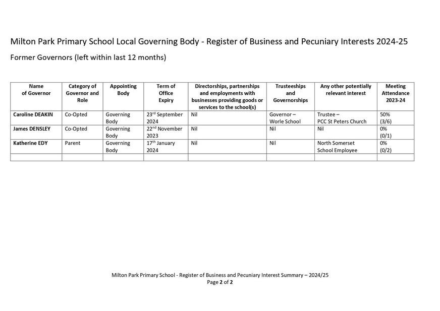 John Sutton Chair of Governors, c/o Milton Park Primary School, Milton Park Road, Weston-super-Mare, North Somerset BS22 8DY