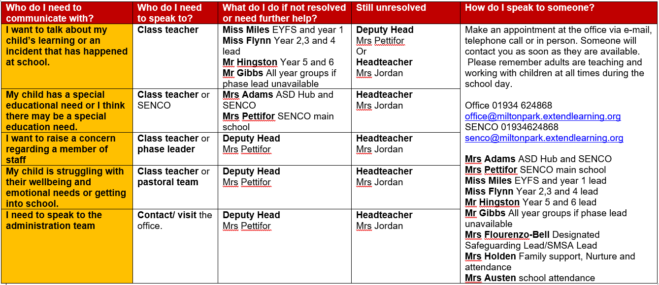 To contact Headteacher - Mrs Katharine Jordan, please email office@miltonpark.extendlearning.org or call 01934 624868.
