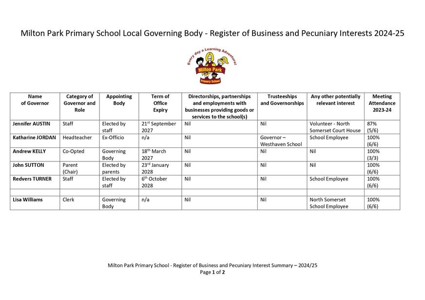 On the 1st October 2017 Milton Park Primary converted to academy status and formally became part of the Extend Learning Academies Network (ELAN). Each school within ELAN has a Local Governing Body (LGB). The LGB of Milton Park Primary School aims to support the whole community of the school using their varying skills, strengths and expertise from all walks of life to enrich the work of the governing body and improve the governance of the school.